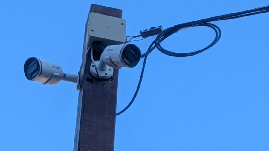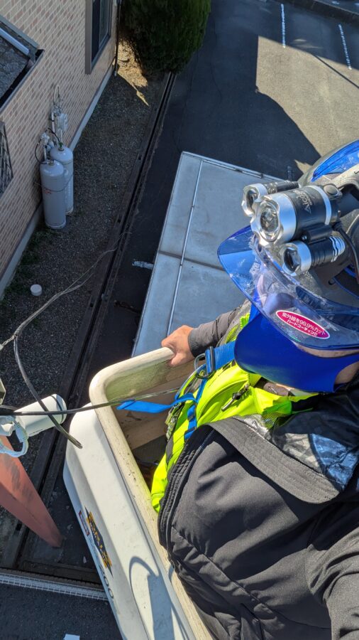 正月明け。 仕事始めのこの日は、年末に点検した防犯カメラのケーブル破断箇所のケーブル交換作業。 支持線のワイヤーが強風の影響なのか切れていたため、垂れ下がっていました。